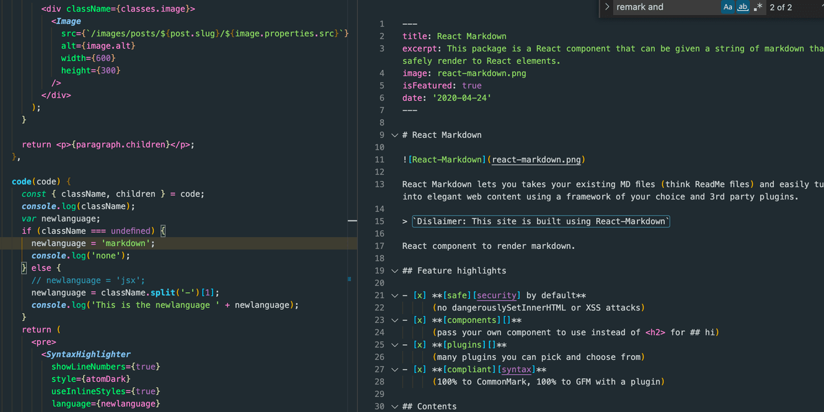 This package focusses on making it easy for beginners to safely use markdown in React. When you’re familiar with unified, you can use a modern hooks based alternative react-remark or rehype-react manually. If you instead want to use JavaScript and JSX inside markdown files, use MDX.